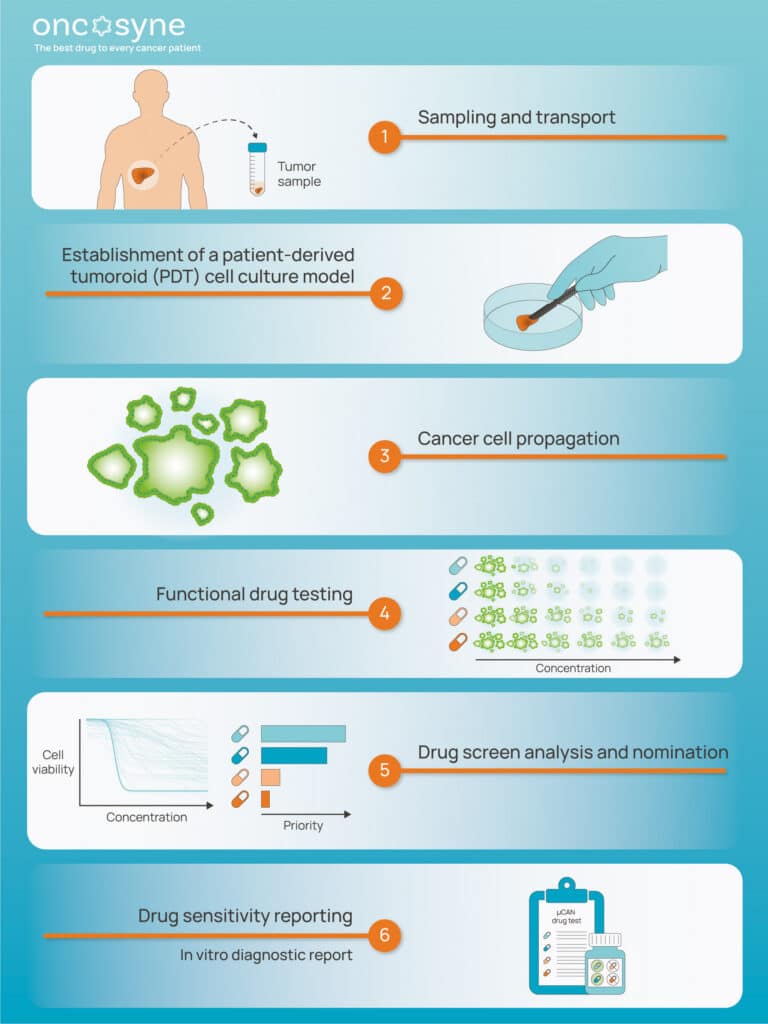 µCAN takes a cancer biopsy sample as input and combines proprietary patient-derived tumoroid culturing conditions with state of-the-art machine learning, and computer-vision guided fluorescence high- content drug screening and analysis, to identify the best therapeutical approach for clinical practice.