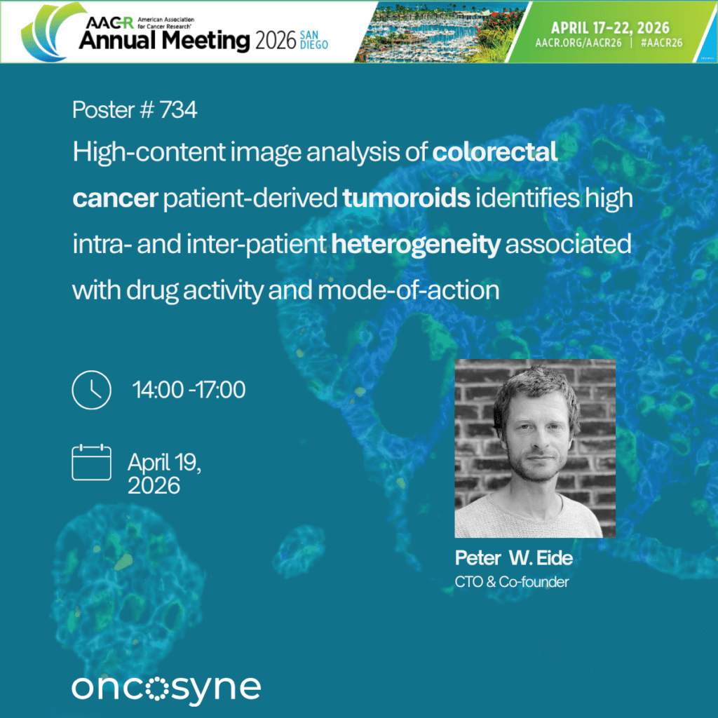 Oncosyne’s CTO and co-founder Peter W. Eide will present new data at AACR 2026 demonstrating how high-content imaging of patient-derived colorectal cancer tumoroids can reveal clinically relevant heterogeneity linked to drug activity and mechanism of action.